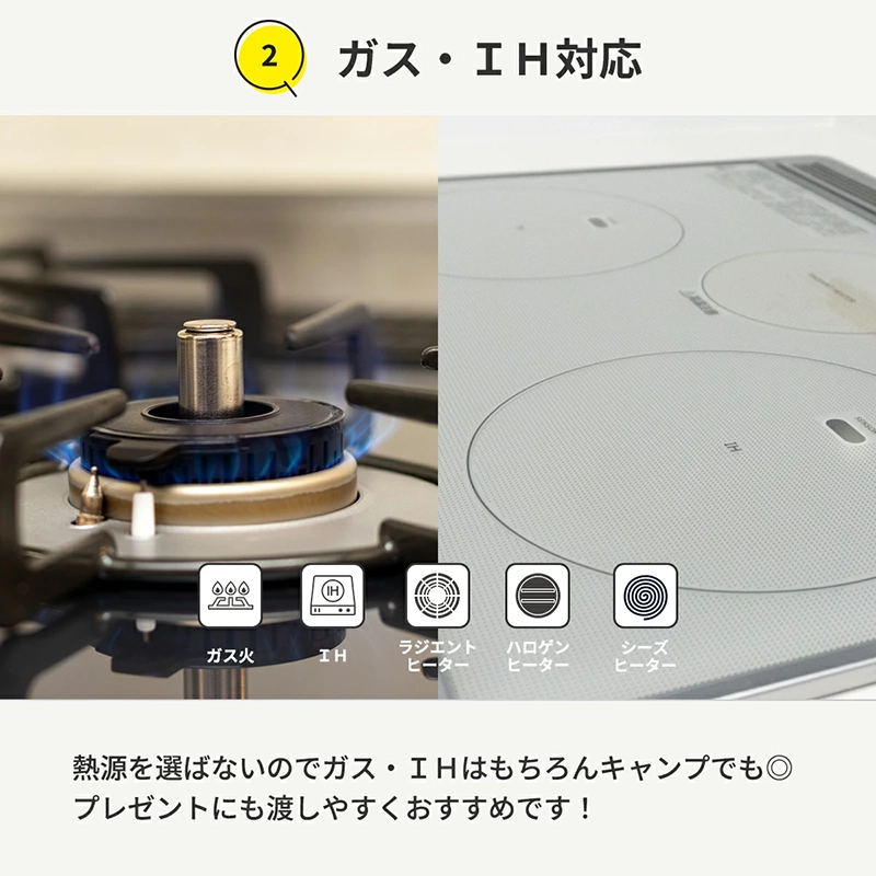 | 対応熱源 | ガスコンロ:〇 IH(100v/200v):〇 ハロゲンヒーター:〇 シーズヒーター:〇 ラジエントヒーター:〇 |