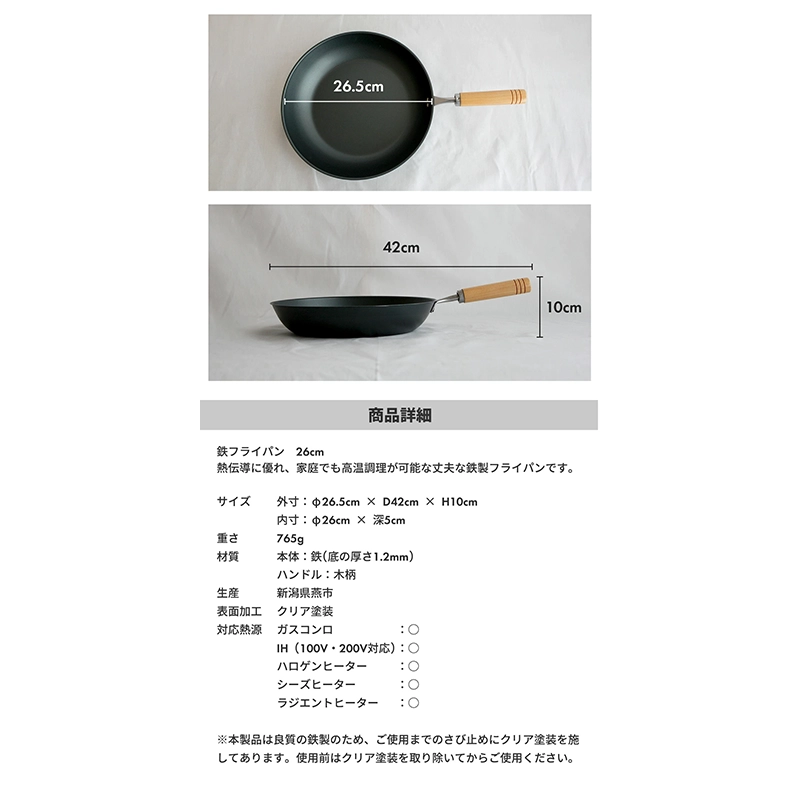 | 注意事項 | 本製品は良質の鉄製のため、ご使用までの錆止めにクリア塗装を施してあります。使用前はクリア塗装を取り除いてからご使用ください。 |
